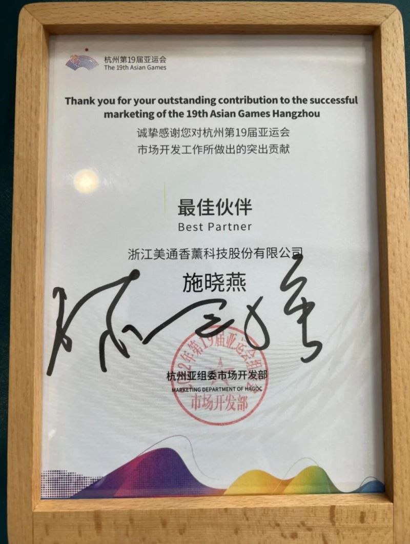 Susie, Vice General Manager of Metone Aromatherapy, was also honoured with the ‘Best Partner Award’ by the Hangzhou Asian Games Organising Committee.